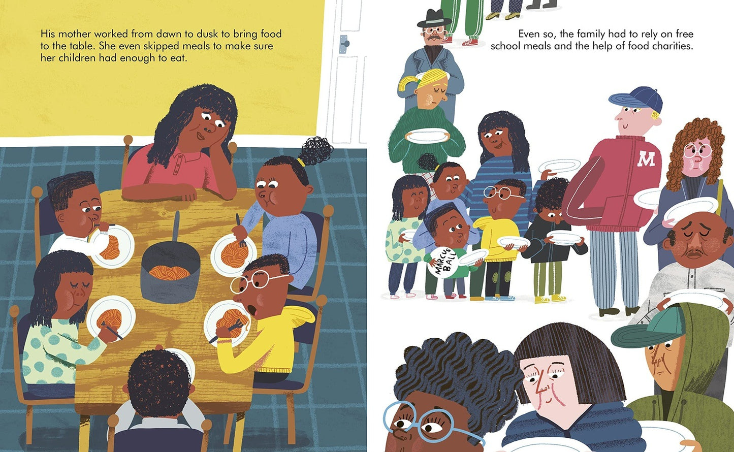 When Marcus was a kid, he had a family that loved him and a talent for football. His mom, Melanie, worked long hours to provide for her family, but sometimes she would go without food herself to make sure that her children had enough to eat. With his mom’s support, Marcus pursued his dreams and progressed through the youth academy at Manchester United Football Club. He worked hard and trained for years to reach the top of the game, making his debut in the Premier League in 2016. But no matter how successful he became, he never forgot where he came from and his experience as a hungry child. When schools were closed during the Coronavirus pandemic of 2020, the situation left schoolchildren without free meals that they would have had. And so Marcus took it upon himself to lead a nation-wide campaign to ensure that no child would go without food. This powerful book features stylish and quirky illustrations and extra facts at the back, including a biographical timeline with historical photos and a detailed profile of the footballer’s life.
