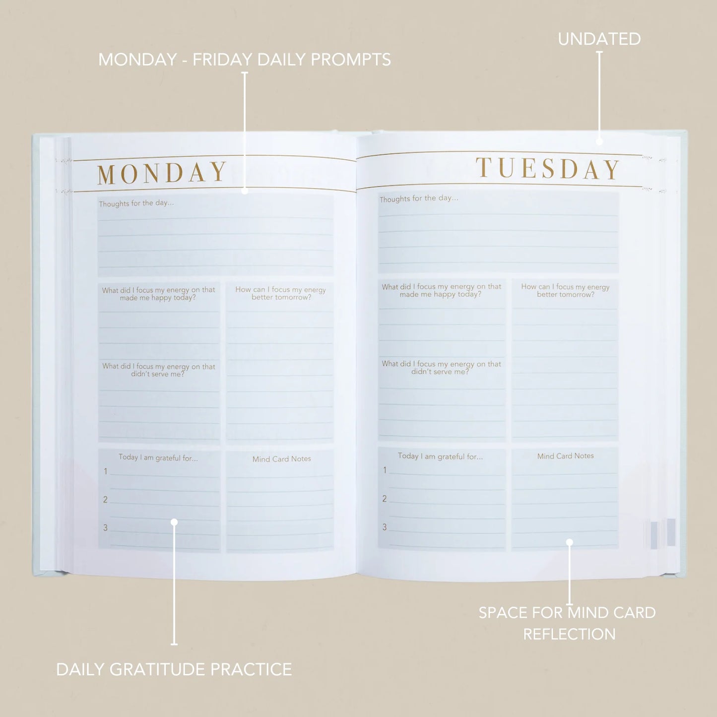 • Monday - Friday prompts with weekly review pages